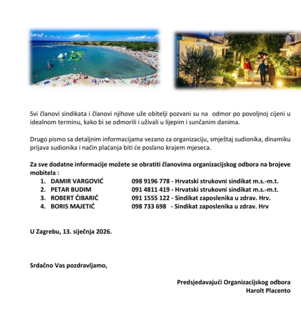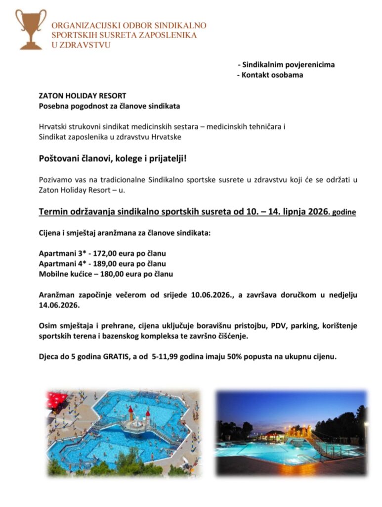 vezano za organizaciju i smještaj sudionika Sindikalno sportskih susreta zaposlenika u zdravstvu Zaton 2025 obavještavamo Vas kako su pripreme gotove.